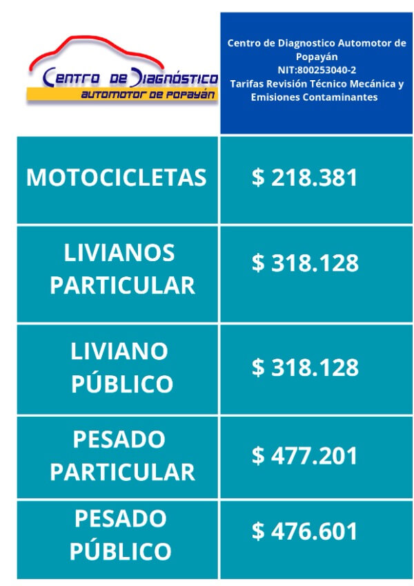 A continuación encontrarás las tarifas vigentes de revisión técnico mecánica para el 2026